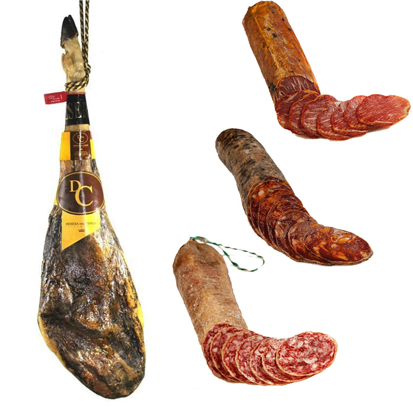 Contiene: Jamón Ibérico de Bellota Etiqueta Roja, Lomo Ibérico, Chorizo Ibérico, Salchichón Ibérico