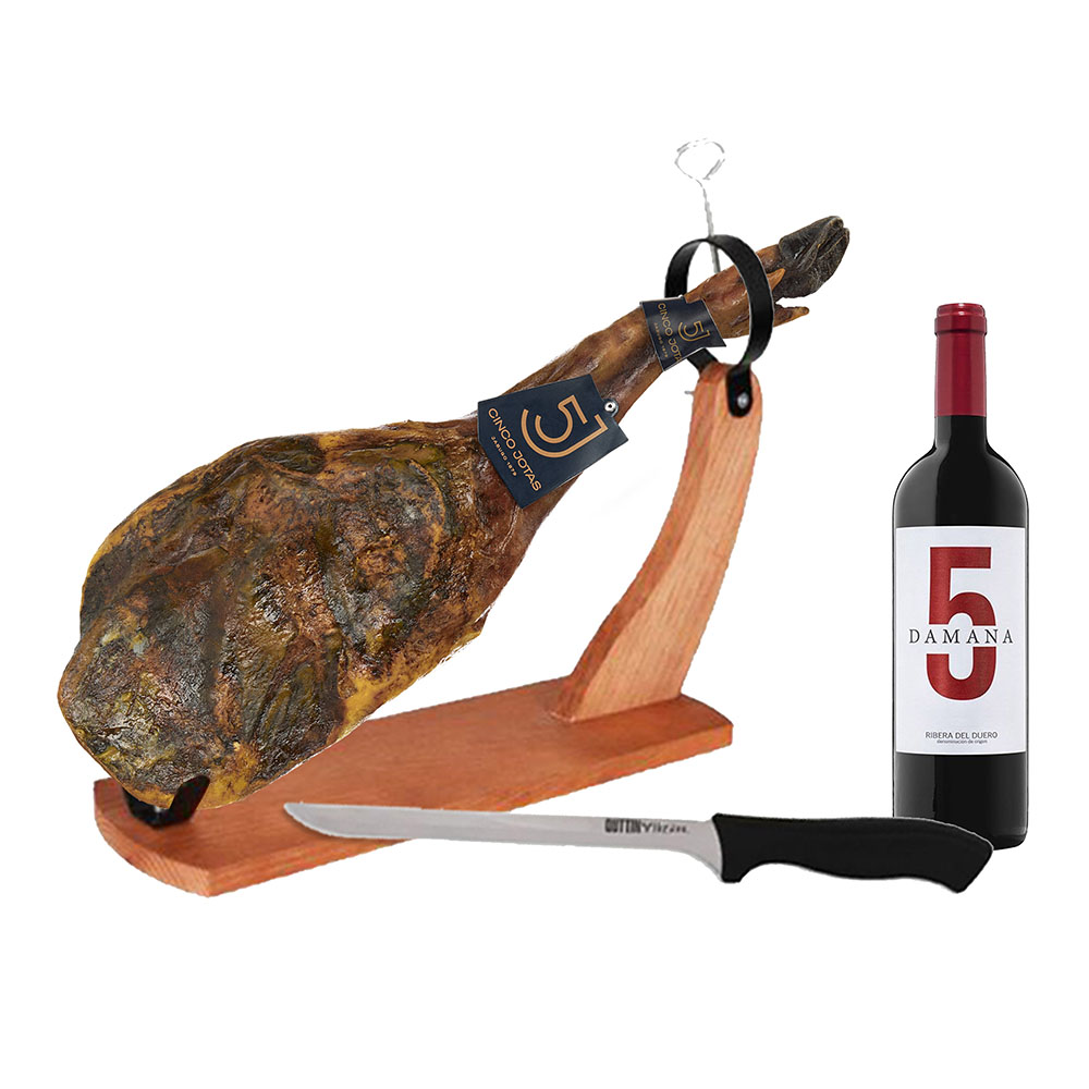 Para acompañarla, se incluye una botella de vino Ribera del Duero, perfecta para resaltar los aromas y la jugosidad de cada loncha.