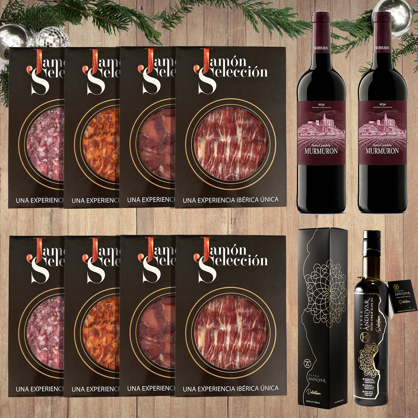El pack incluye lo mejor de Jamón Selección: 2 sobres de jamón 100% ibérico de bellota cortado a cuchillo, 2 sobres de lomo 100% ibérico de bellota, 2 sobres de chorizo 100% ibérico de bellota y 2 sobres de salchichón 100% ibérico de bellota, todos ellos presentados en sobres premium, listos para servir y disfrutar en cualquier ocasión especial. Para complementar esta experiencia gourmet, la cesta incluye 2 botellas de vino tinto Rioja, perfecto para maridar con los productos ibéricos, y una botella de aceite verde premium Terra Andújar, un aceite de oliva virgen extra de gran calidad que añadirá el toque final a cualquier plato navideño.